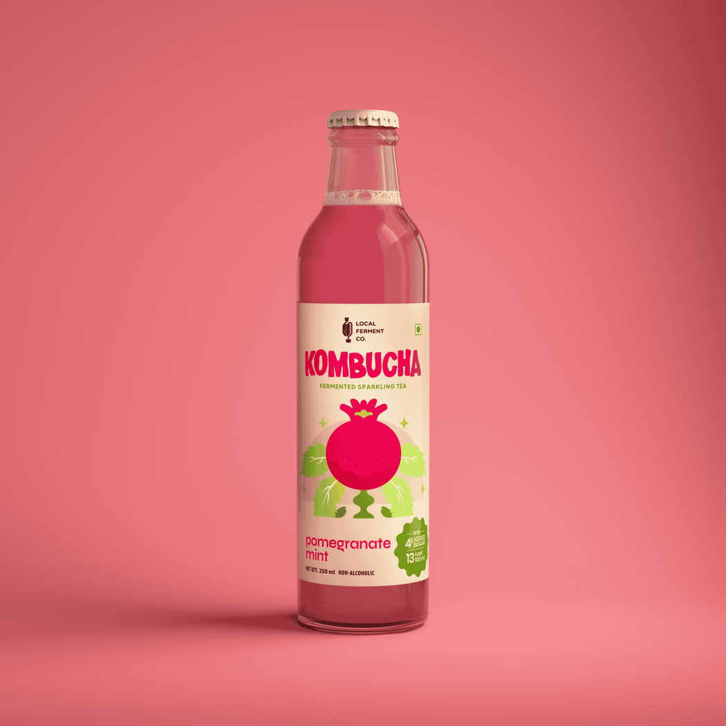 Ingredients: Black tea, cold-pressed pomegranate juice, fresh mint leaves, kombucha cultures, water, organic cane sugar [🔍 clean labels, nothing else]